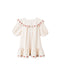 Our Cordelia Dress features elasticized sleeve openings and dainty embroidered ruffle along the neck and bottom skirt ruffle.