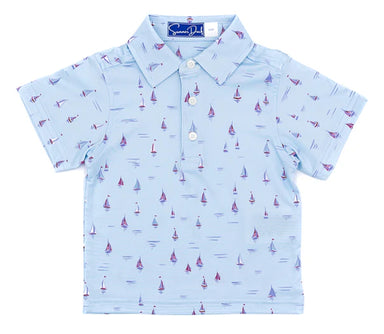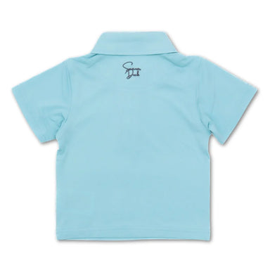 • Light blue t-shirt with a dog and life buoy graphic on a white background