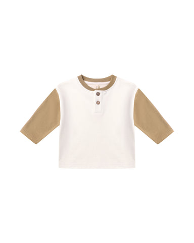 A cozy long sleeve tee with a relaxed fit, featuring contrast sleeves, neckline, and front placket, with soft coconut buttons for easy changes. Fea...