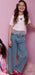 - Trendy denim jeans embellished with rainbow-colored sparkles for a fun and vibrant look.