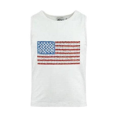 Description Classic white tank top featuring a rhinestone American flag design in red, white, and blue Sleeveless cut for easy movement and breath...