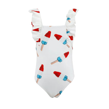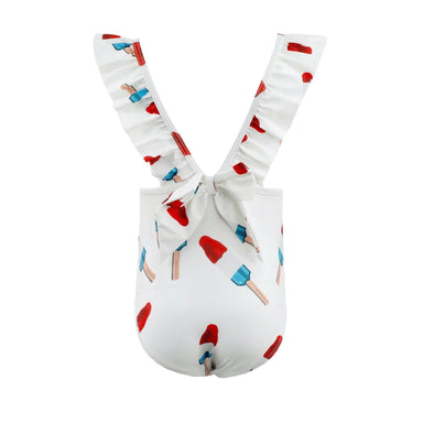 Description Adorable one-piece swimsuit with playful rocket pop print Sweet ruffle shoulder straps add a fun, feminine touch Comfortable stretch f...