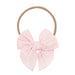 Truly one of a kind! Each bow is hand-tied by local moms with one of a kind material and attached to a one-size-fits-all nylon headband. All bows and edges are secured and sealed so they don’t come undone.