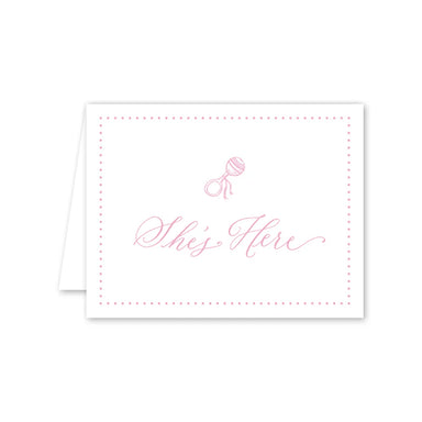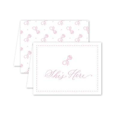Baby Rattle Pink Card Art by Sarah Ragan DIMENSIONS: 4.25 x 5.5 inches PRINTING: Flat Printing on 120 lb Mohawk Eggshell White Paper CARD ...