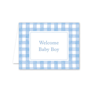 Gingham Blue Baby Card Art by Shanna Masters DIMENSIONS: 4.25 x 5.5 inches PRINTING: Flat Printing on 120 lb Mohawk Eggshell White Paper CARD...