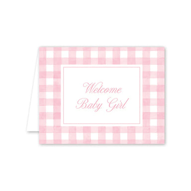 Gingham Pink Baby Card Art by Shanna Masters DIMENSIONS: 4.25 x 5.5 inches PRINTING: Flat Printing on 120 lb Mohawk Eggshell White Paper CARD...