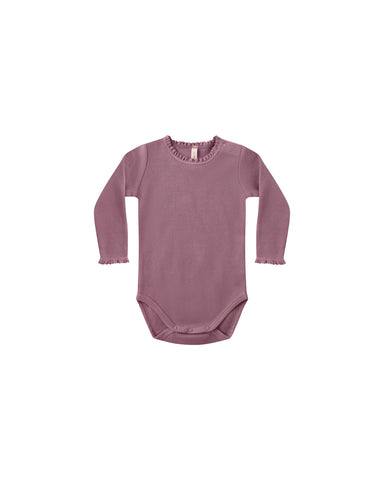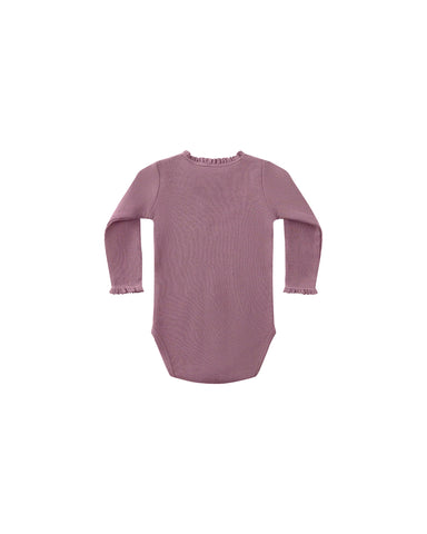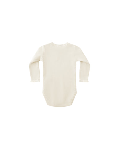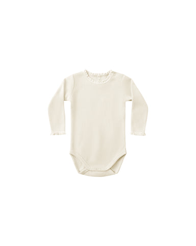 Long sleeve onesie in our lightweight waffle knit, featuring the sweetest crochet lace ruffle detail. Designed with shoulder and bottom snaps for e...