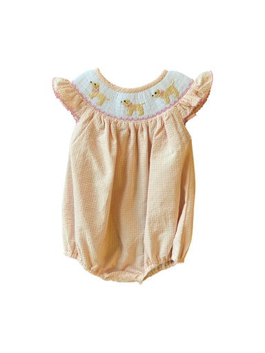Our Callie Romper features a sweet embroidered collar, smocked front, and gathered long sleeves. Buttons at the back and snaps at the bottom make f...