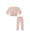 Our Spongey Knit Set includes a pullover sweatshirt with balloon sleeves and an elasticized hem, paired with snug leggings featuring an elastic waistband.