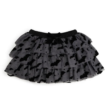 The Flocked Bats Halloween Bow Tiered Tutu is a fun skirt and dress up tutu for celebrating Halloween! Features: Gray tulle accented with black v...
