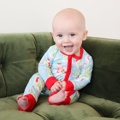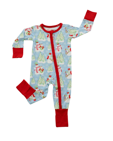 Frosty fun from head to toe! This dreamy-soft bamboo romper is covered in cheerful snowmen and twinkling Christmas trees on a wintery blue backgrou...