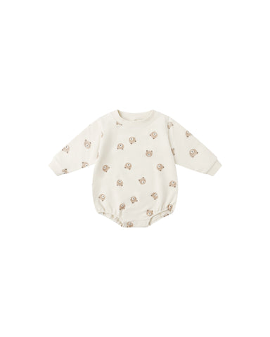 Our Terry Cloth Romper features ivory contrast binding, front placket with coconut buttons, and bottom snaps for easy changing.  Featuring our 'sky...