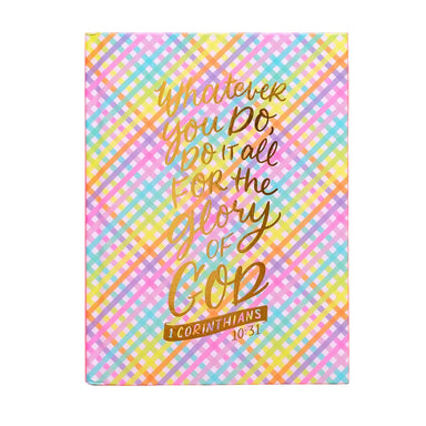 This spiritual themed notebook includes a motivational bible verse from 1 Corinthians 10:31 in gold foil on the outside cover and a beautiful displ...