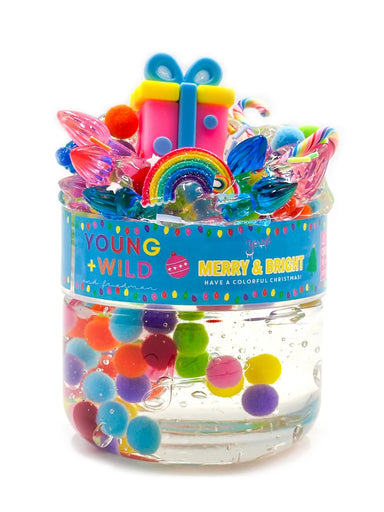 The Merry & Bright Slime features a clear gel base filled with colorful pom poms and festive charms, paired with a light peach scent that smell...