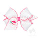 Add a sprinkle of holiday cheer with this moonstitch edge grosgrain bow featuring adorable pink Christmas embroidery.